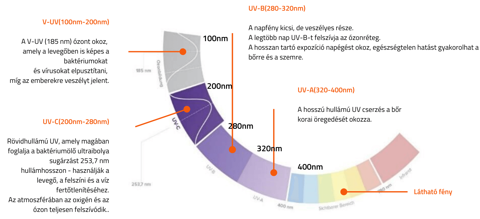 Az UV-C fény sugárzása molekuláris szinten, roncsolja a vírusok és baktériumok DNS-ét, fehérjéit, így azok rövid időn belül elpusztulnak. Az UV-C fénnyel működő fertőtlenítők kiválóan alkalmasak zárt terek felület és légretőtlenítésére. Hosszútávon fejti ki hatását és bármilyen helyen biztonságosan alkalmazhatók. Az eljárás régóta bevált és egyszerű fizikai eljáráson alapul.